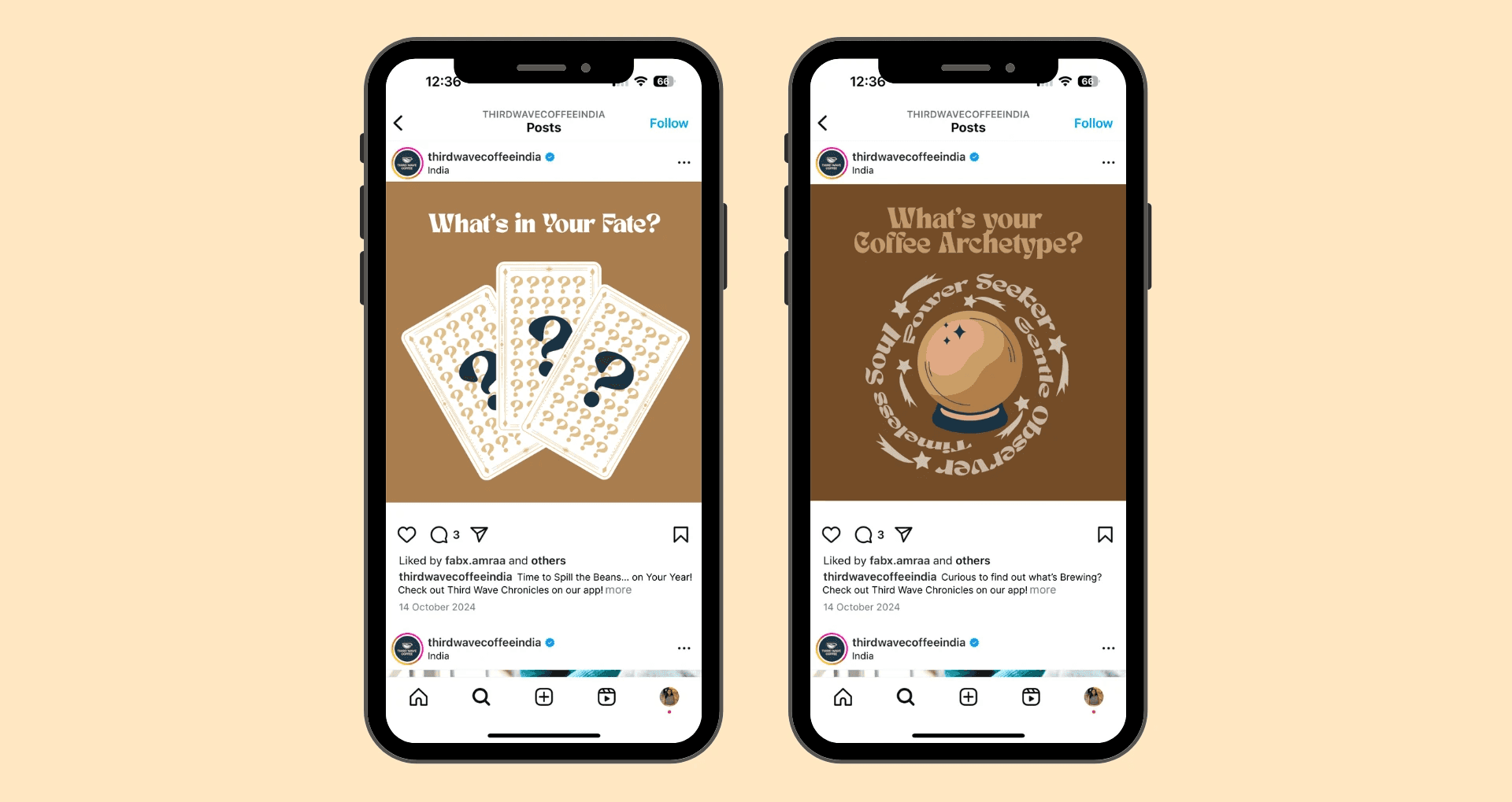 Third Wave Chronicles adapts the café's existing illustration style with tarot mysticism, adding warm browns to signify coffee culture and fortune-telling elements. Each customer receives a personalized Coffee Archetype based on their purchase history revealing taste profiles, adventurousness with new flavors, and personalized recommendations. The app experience is designed as a journey of mystery and revelation, starting with intrigue and culminating in a story-like template optimized for social sharing, turning loyalty members into organic brand ambassadors.